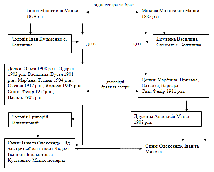 Зазначу, що ми, діти Федора та Анастасії Манко, жодного разу не зустрічалися із двоюрідними тітками, зокрема Кузьменко (Манко) Явдохою Іванівною, а щодо дядьків, то знаний нами був лише контужений під час Харківської операції в другій світовій війні Василь Іванович, який часто заходив до нас в гості в село Потоки. Якби не його візити, то ми б не знали взагалі нікого. Другий двоюрідний дядько Федір чи Алфей працював вчителем, служив моряком на Балтійському флоті, де його застала війна і під час одного із боїв він загинув.